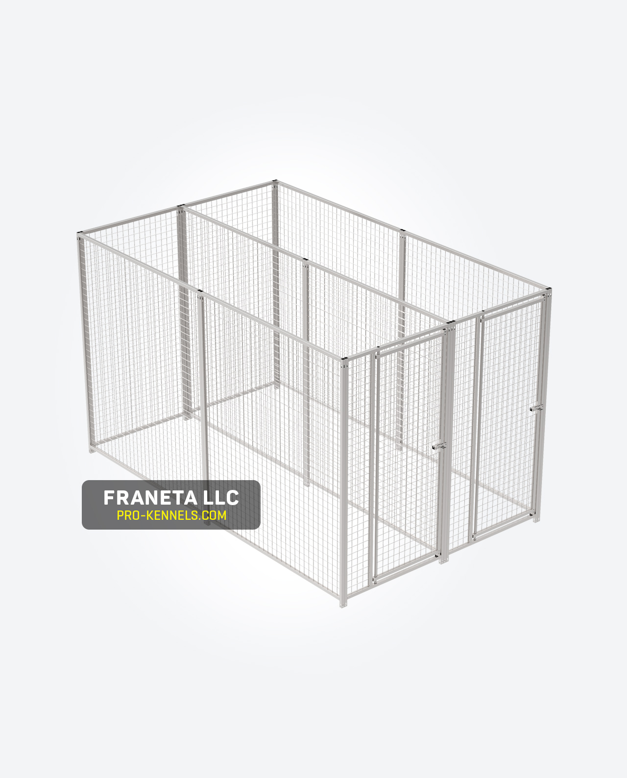 Complete Multiple (2-Run) 3′W x 10′L x 6′H free standing Hot-Dip Galvanized Welded Wire Mesh Dog Kennel made of gauge 6 wire, squares are 2×2 inches, with stainless steel door handle, stainless steel hardware and plastic leg inserts.