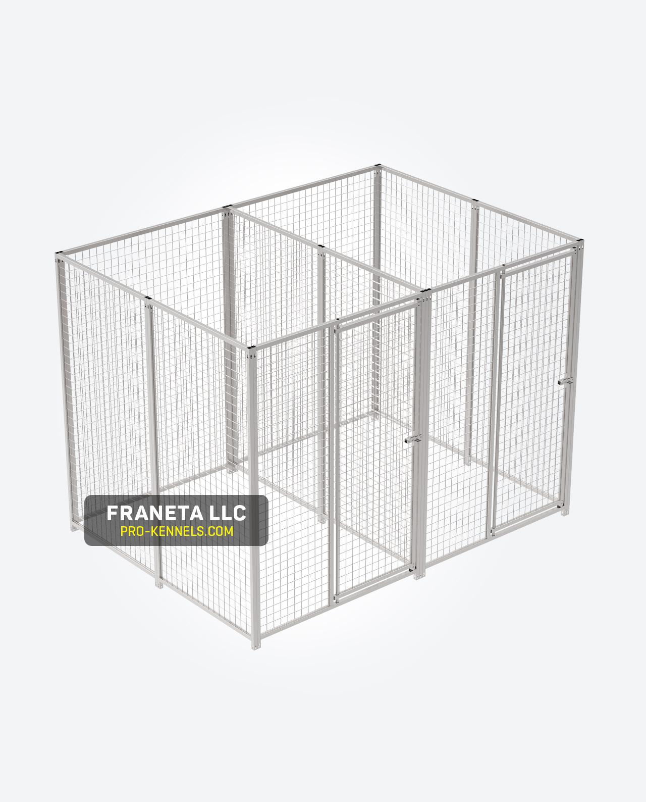 Complete Multiple (2-Run) 4′W x 6′L x 6′H free standing Hot-Dip Galvanized Welded Wire Mesh Dog Kennel made of gauge 6 wire, squares are 2×2 inches, with stainless steel door handle, stainless steel hardware and plastic leg inserts.