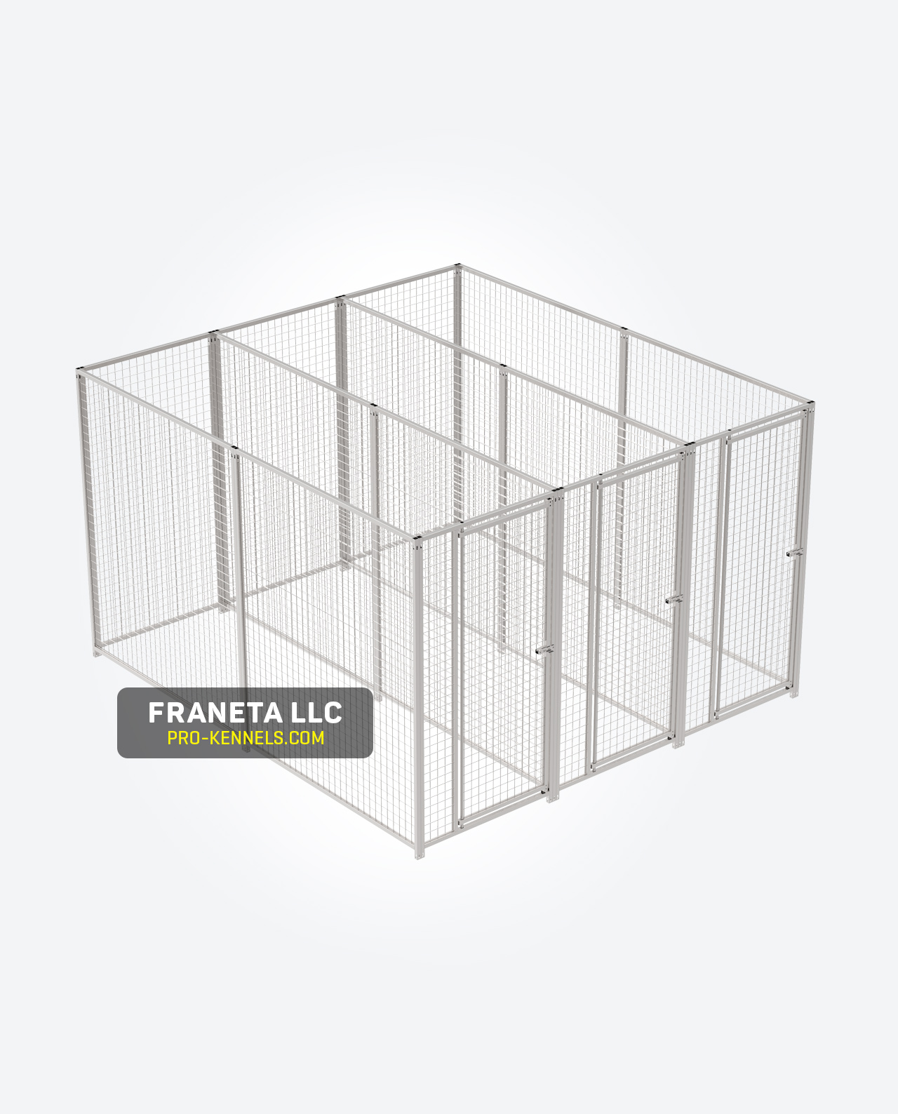 Complete Multiple (3-Run) 3′W x 10′L x 6′H free standing Hot-Dip Galvanized Welded Wire Mesh Dog Kennel made of gauge 6 wire, squares are 2×2 inches, with stainless steel door handle, stainless steel hardware and plastic leg inserts.