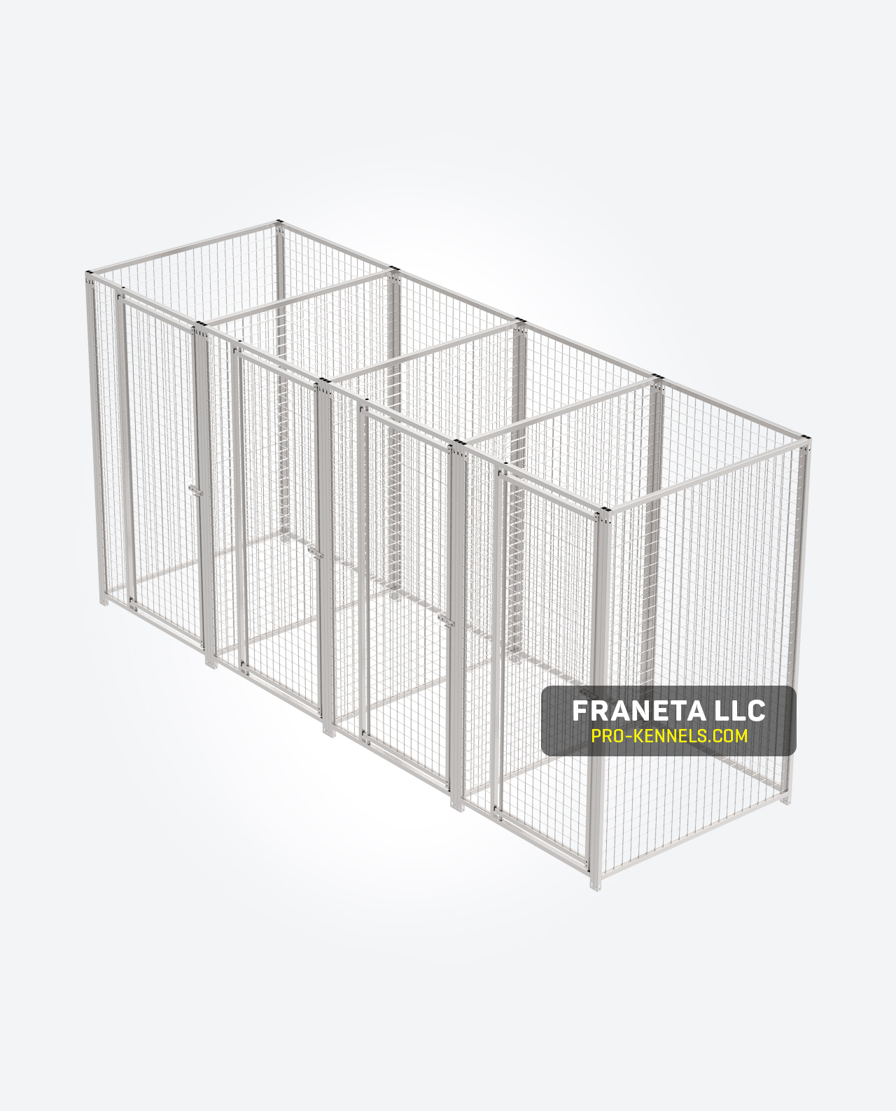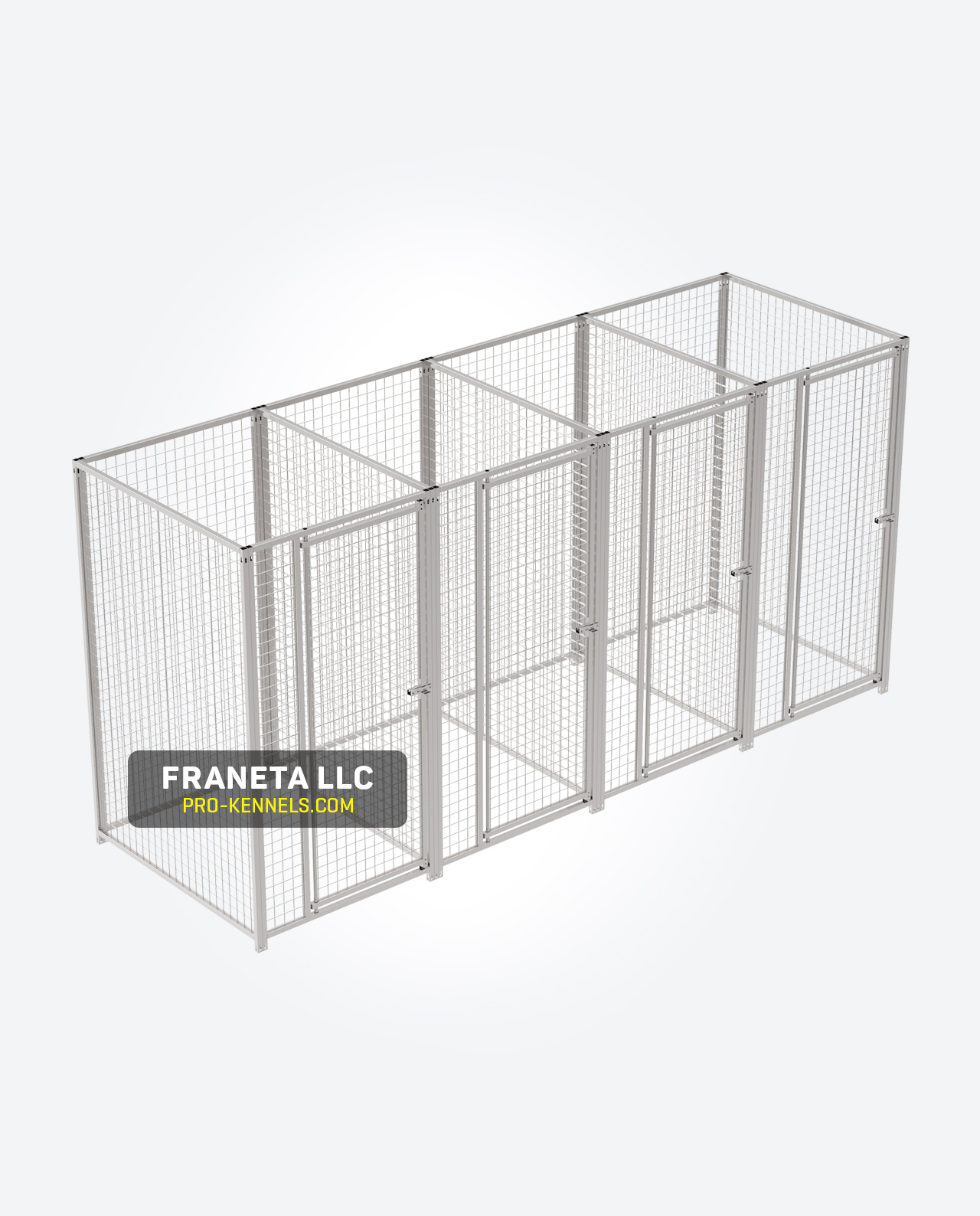 Complete Multiple (4-Run) 3′W x 4′L x 6′H free standing Hot-Dip Galvanized Welded Wire Mesh Dog Kennel made of gauge 6 wire, squares are 2×2 inches, with stainless steel door handle, stainless steel hardware and plastic leg inserts.