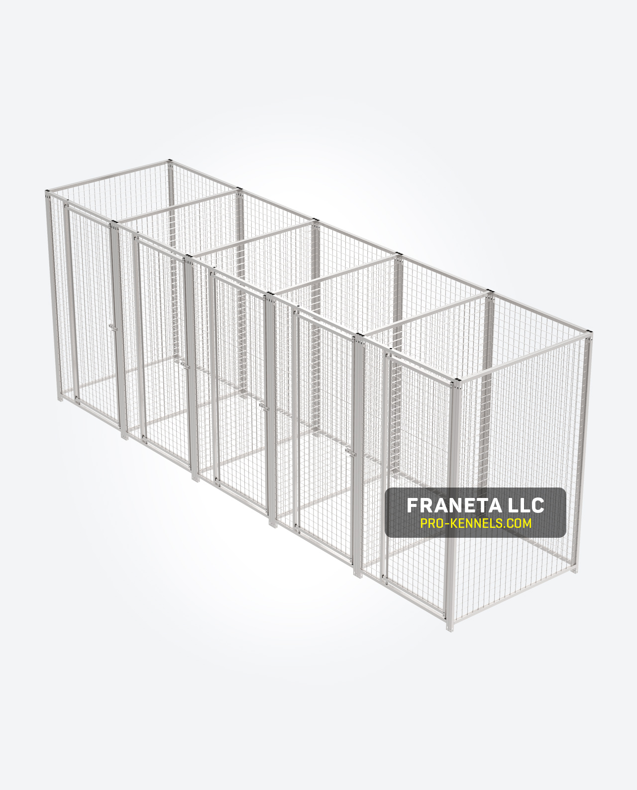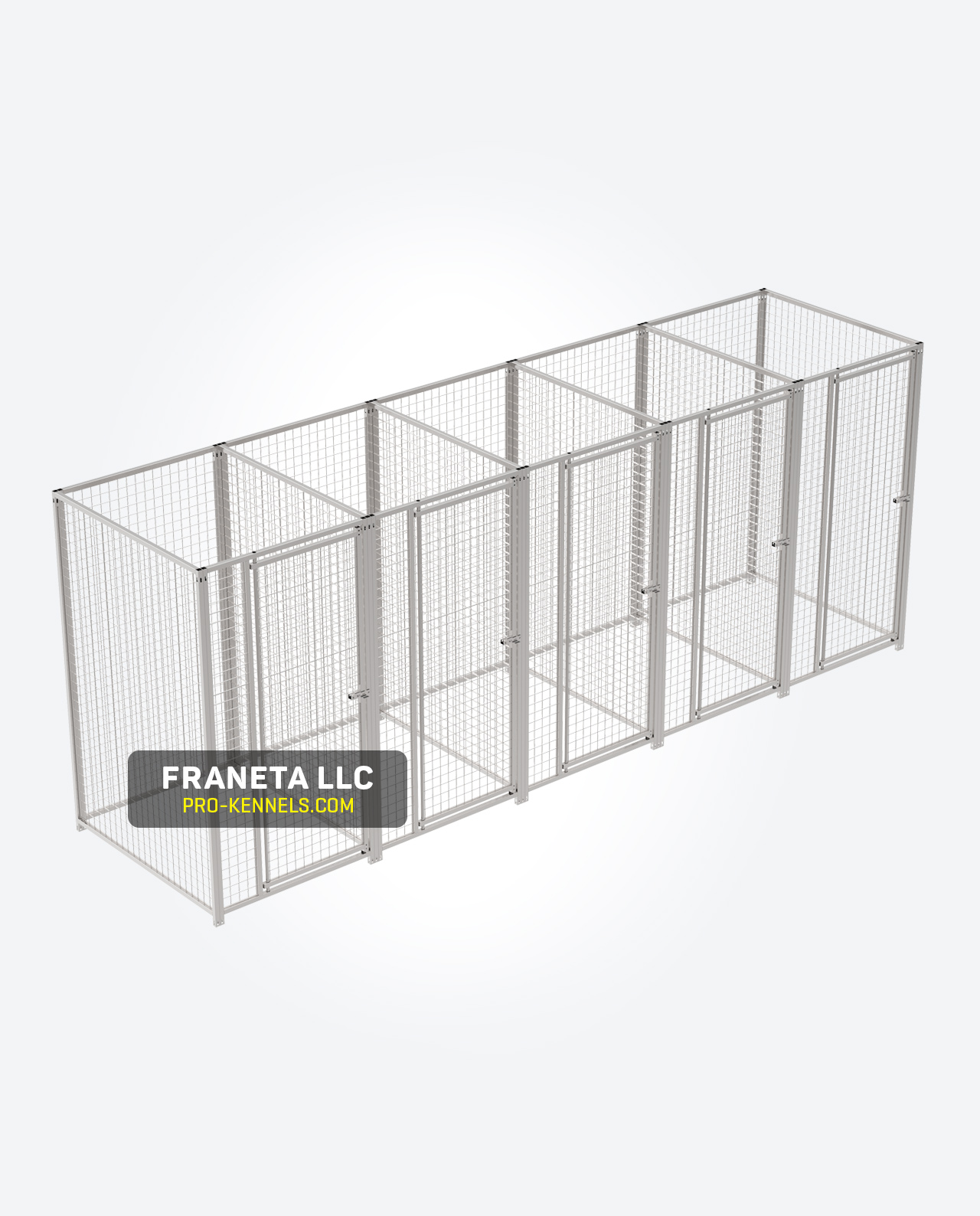 Complete Multiple (5-Run) 3′W x 4′L x 6′H free standing Hot-Dip Galvanized Welded Wire Mesh Dog Kennel made of gauge 6 wire, squares are 2×2 inches, with stainless steel door handle, stainless steel hardware and plastic leg inserts.