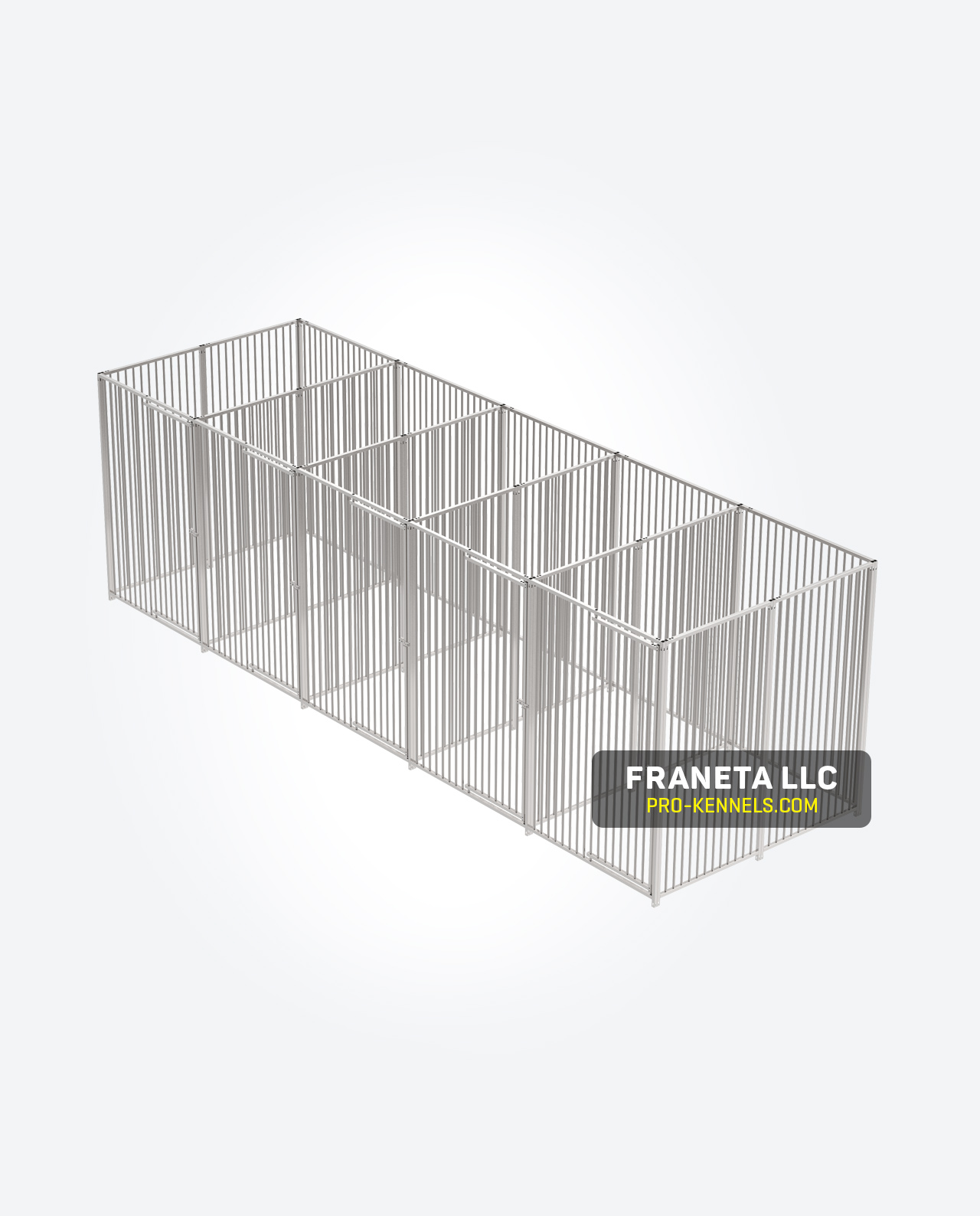Complete Multiple (5-Run) 5′W x 8′L x 6′H free standing Hot-Dip Galvanized Vertical Bars/European Style Dog Kennel with stainless steel door handle and stainless steel hardware.